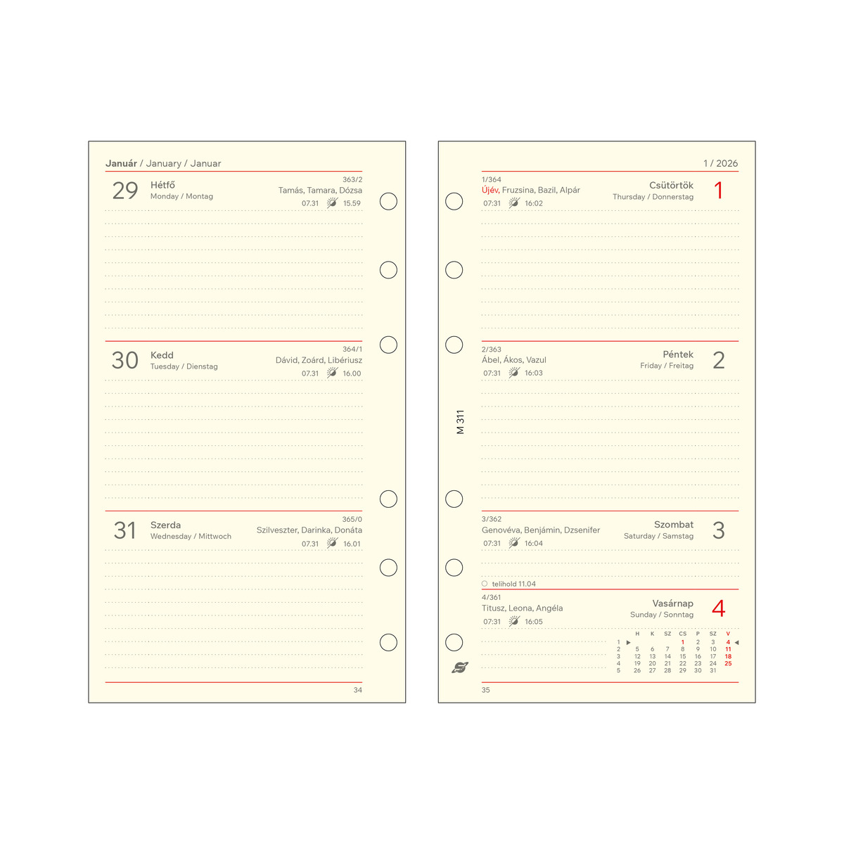 - Kialakítás: 3 nyelvű naptár, hazai és nemzetközi ünnepnapok, magyar névnapok, napkelte, napnyugta, holdfázisok