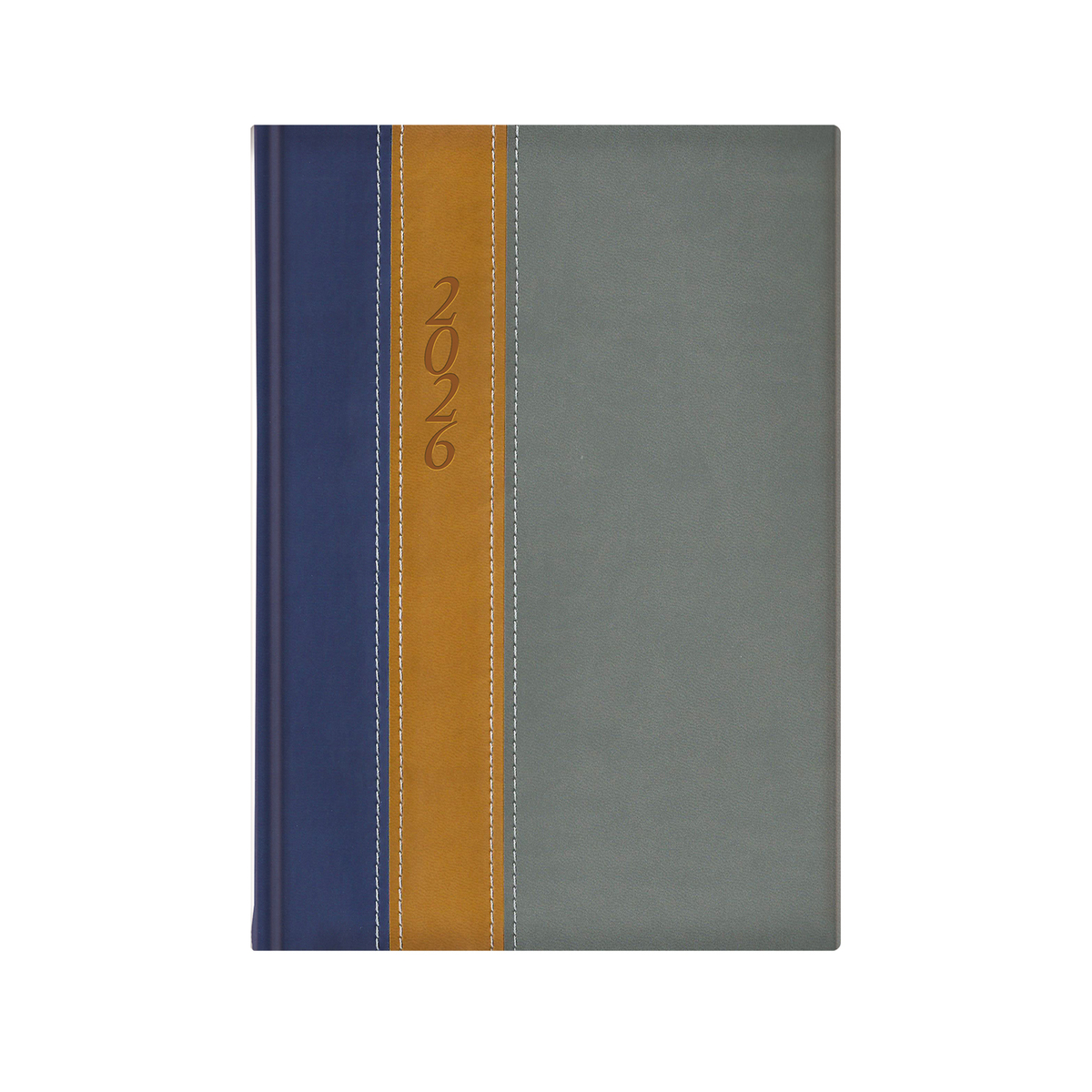 Kétféle, matt, bőrhatású és eltérő felületű, hőre színeződő műbőr bevonóval, varrással díszitett, fehér tömbös napi beosztású naptár, jelzőszalaggal és sarokperforációval. Elöl-hátul szivacsos fedlap. Színes térképet tartalmaz.