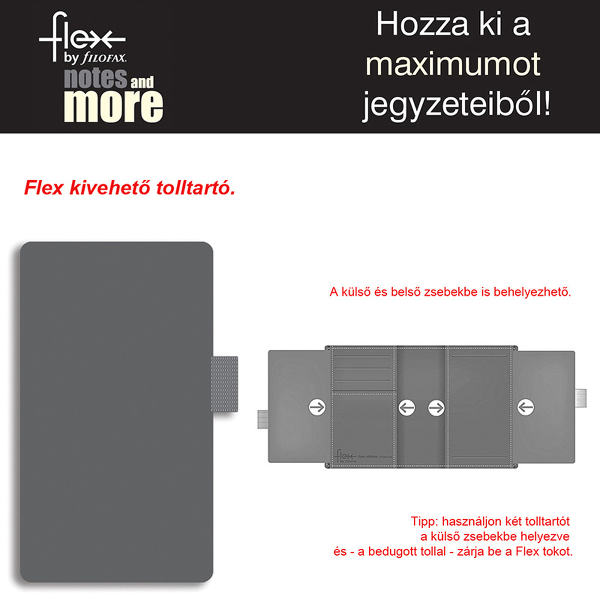 A Flex tolltartó a Flex tok külső és belső zsebeibe is behelyezhető. Két tolltartó és egy toll segítségével a Flex borító zárhatóvá tehető. Bővebben a Flex sorozat a Filofax újdonsága, a mai kor igényeinek tökéletesen megfelelő jegyzet- és vázlatfüzet. És ennél sokkal több, hiszen a Flex egy rendszer, mely számos funkciót foglal magába:- Egy elegáns, tökéletesen kimunkált tartót.- Egy kivehető tolltartót.- Egy kivehető jegyzetfüzetet.- Egy kivehető Flex teljes mértékben személyre szabható a cserélhető betétekkel. Használja ki ezt a páratlan lehetőséget ötletei, jegyzetek és vázlatok rögzítésére és hozza ki a maximumot jegyzeteiből.