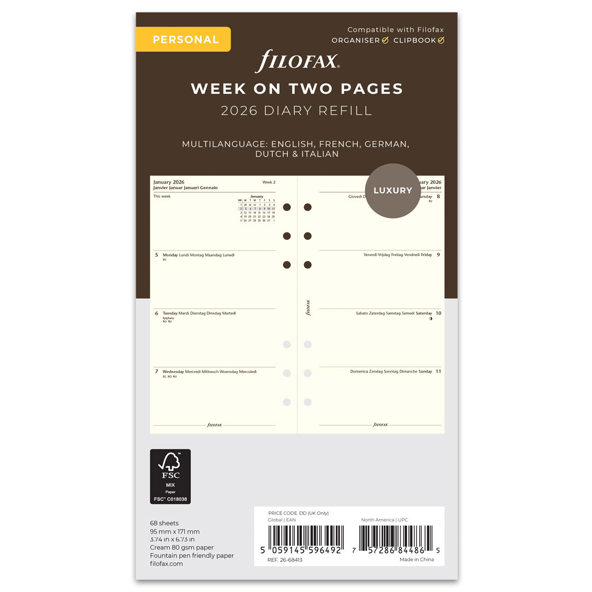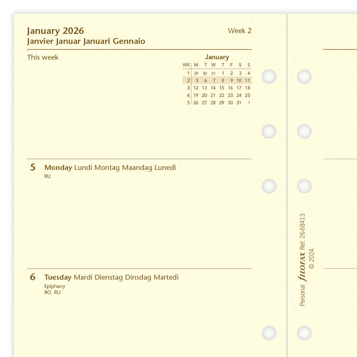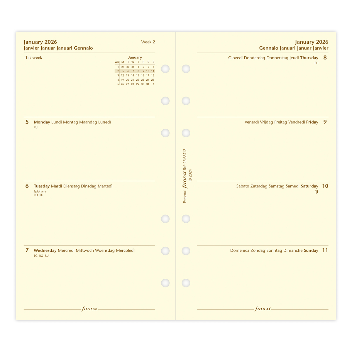 Filofax Naptárbetét Heti 1 hét / 2 oldal 5 nyelvű Personal Krém 2026