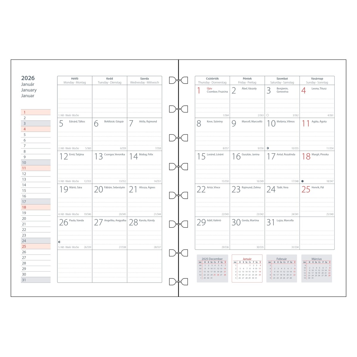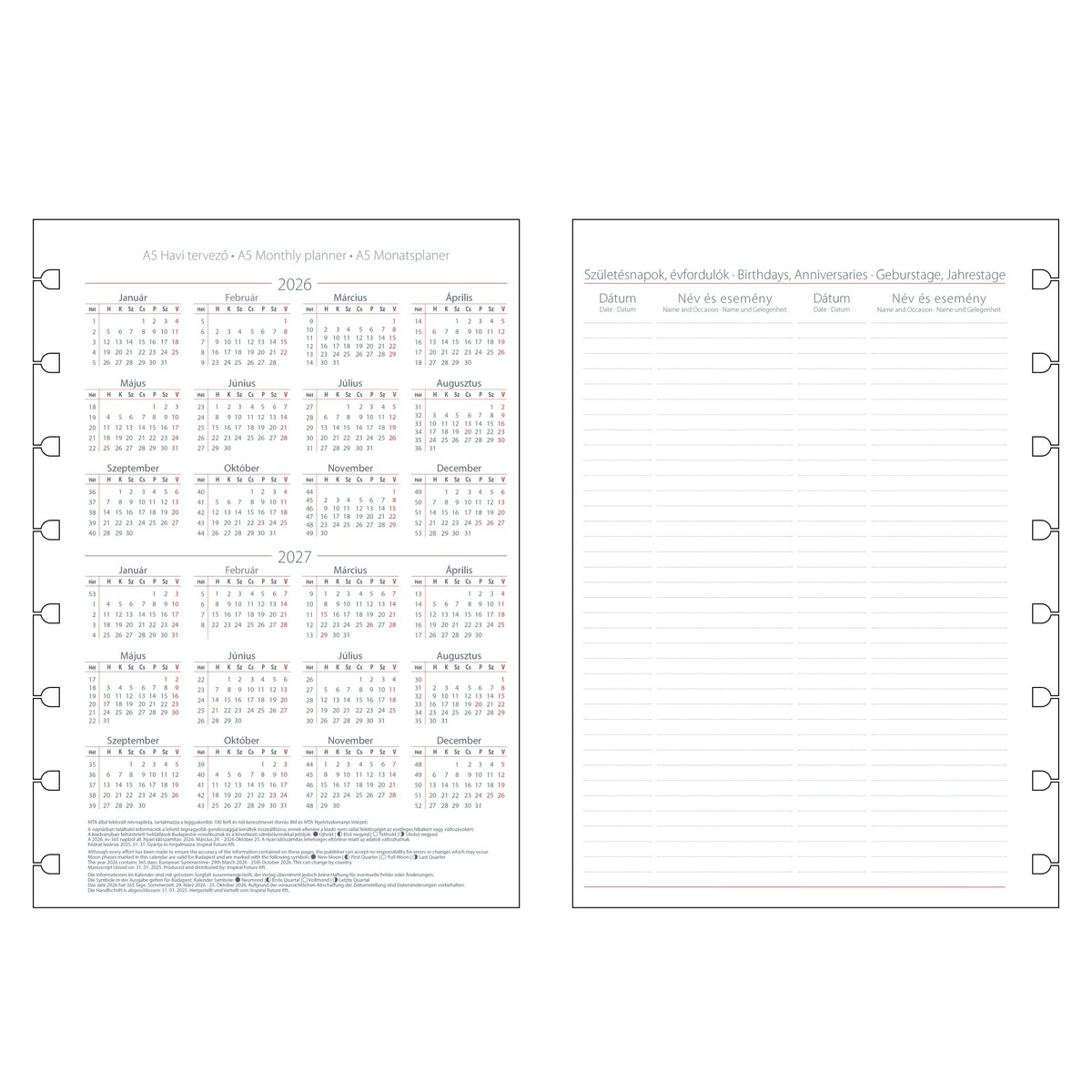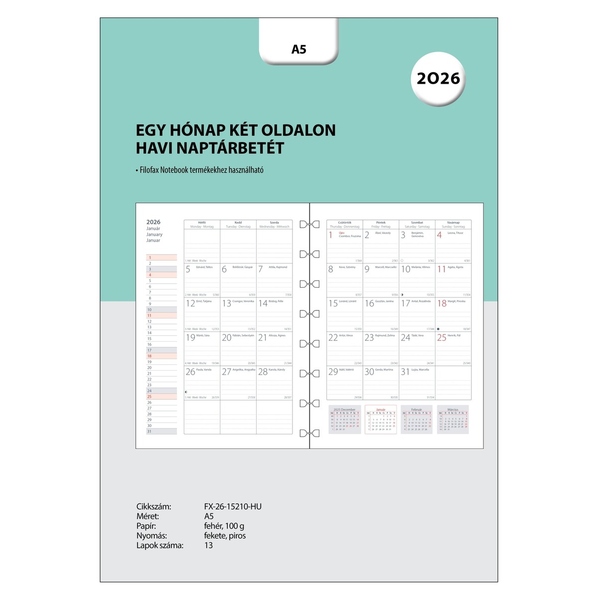 Filofax Notebookhoz Naptárbetét Havi HU A5 Fehér 2026