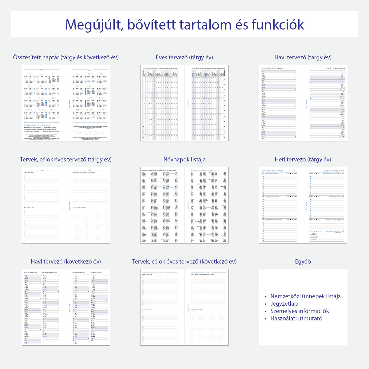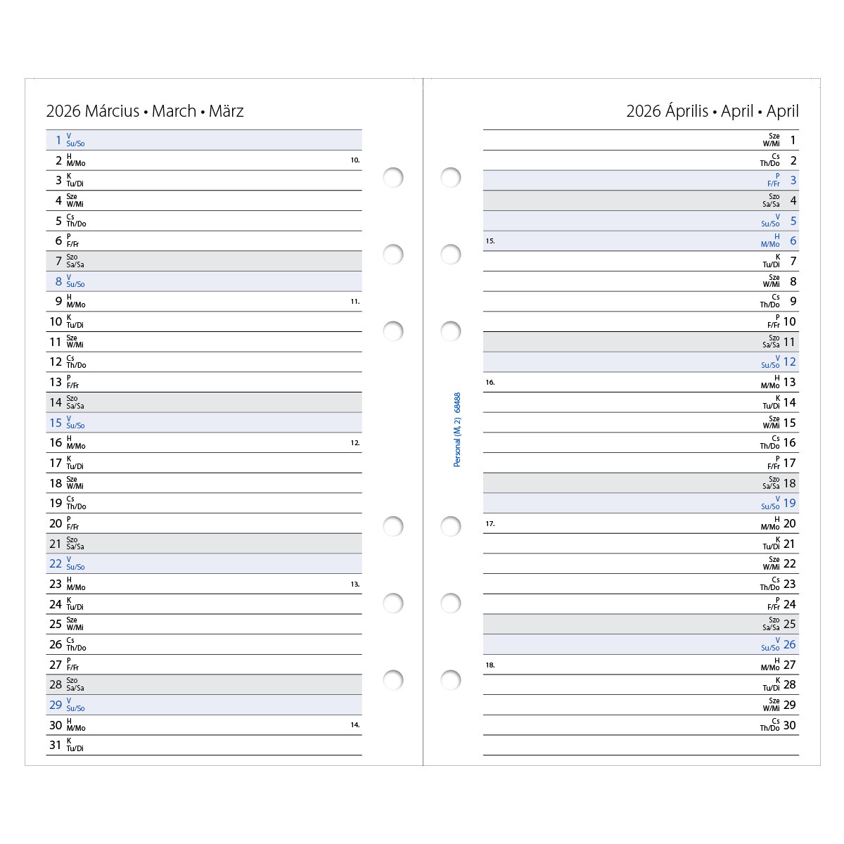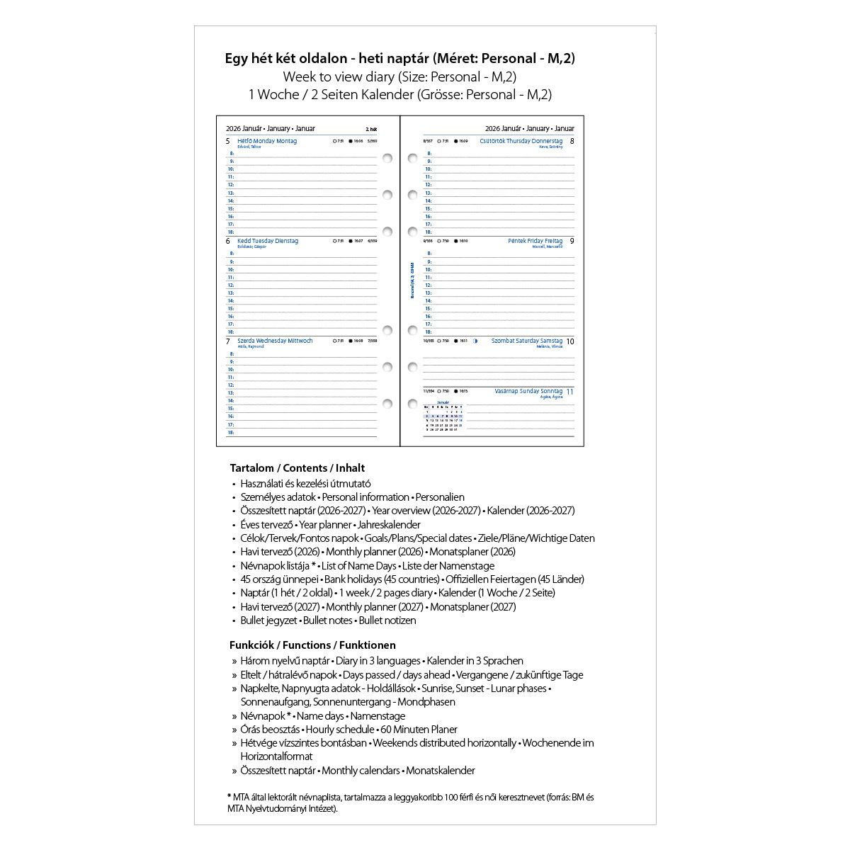 Gyűrűs kalendáriumokhoz (Filofax és más márkák*) használható, magyar-angol-német nyelvű naptárbetét, Personal (M, 2) méretben, megújult, bővített tartalommal:- Használati és kezelési útmutató- Személyes adatok- Összesített naptár (2026-2027)- Éves tervező (2026)- Célok/Tervek/Fontos napok (2026)- Havi tervező (2026)- Névnapok listája **- 45 ország ünnepei- Naptár (2026 - 1 hét / 2 oldal)- Célok/Tervek/Fontos napok (2027)- Havi tervező (2027)- Bullet jegyzet