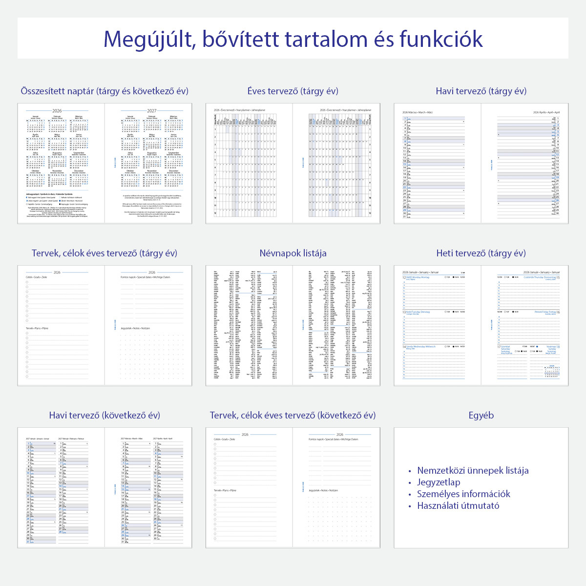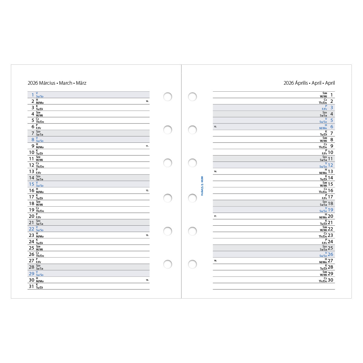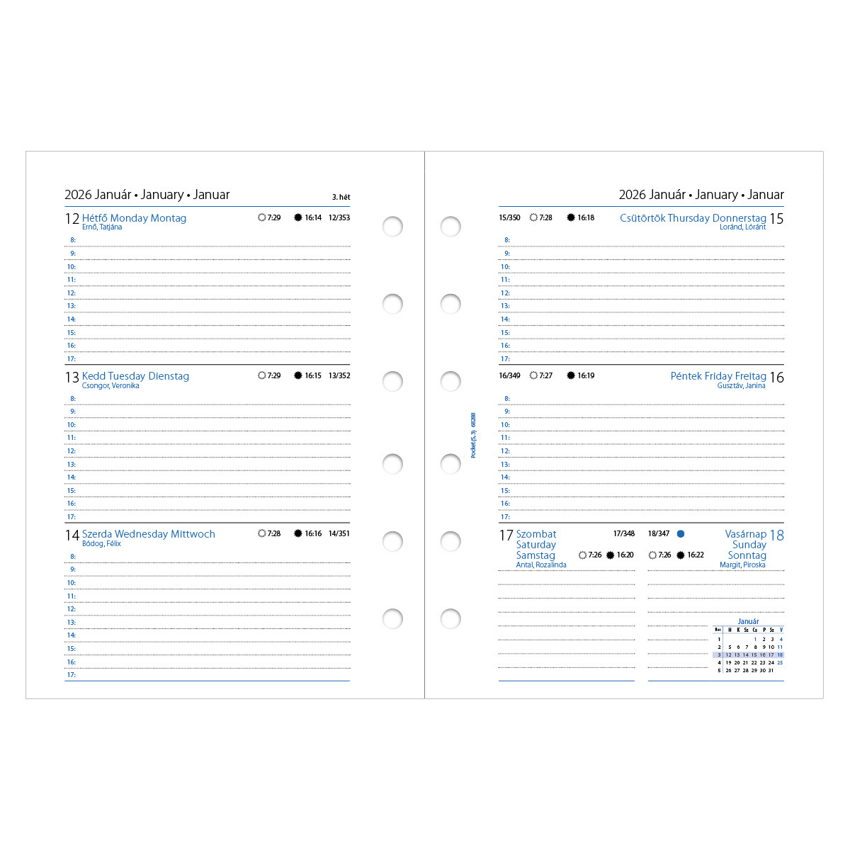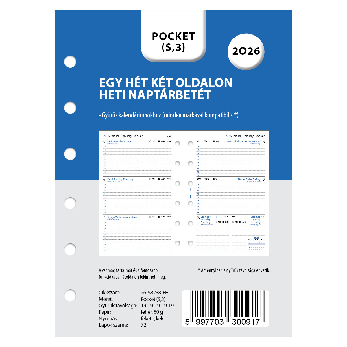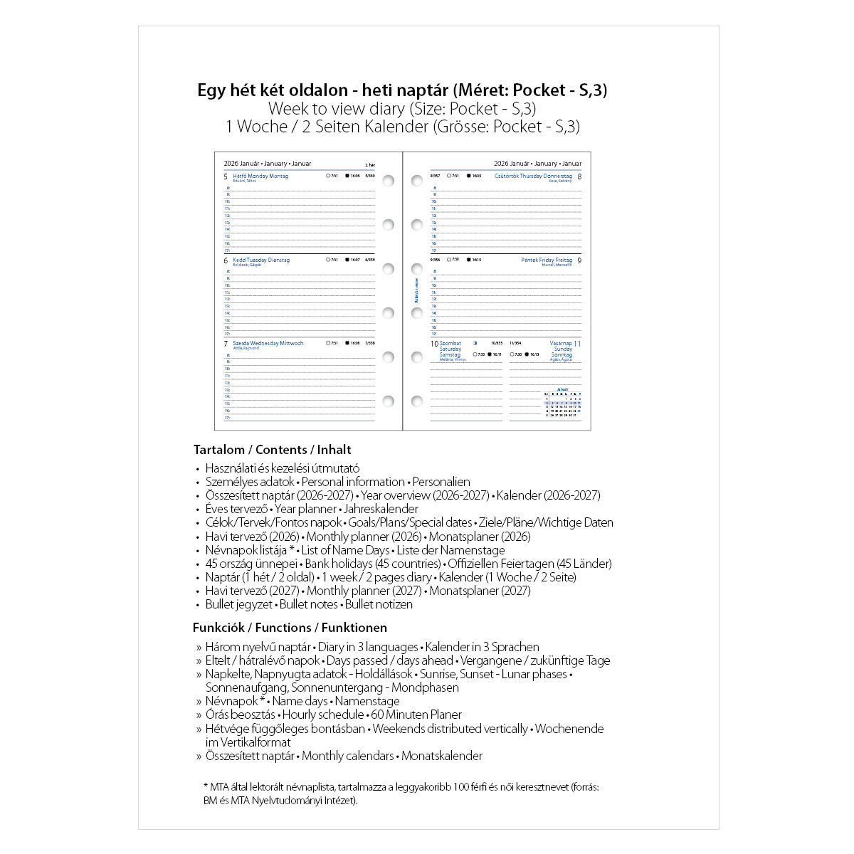 Gyűrűs kalendáriumokhoz (Filofax és más márkák*) használható, magyar-angol-német nyelvű naptárbetét, Pocket (S, 3) méretben, megújult, bővített tartalommal:- Használati és kezelési útmutató- Személyes adatok- Összesített naptár (2026-2027)- Éves tervező (2026)- Célok/Tervek/Fontos napok (2026)- Havi tervező (2026)- Névnapok listája **- 45 ország ünnepei- Naptár (2026 - 1 hét / 2 oldal)- Célok/Tervek/Fontos napok (2027)- Havi tervező (2027)- Bullet jegyzet