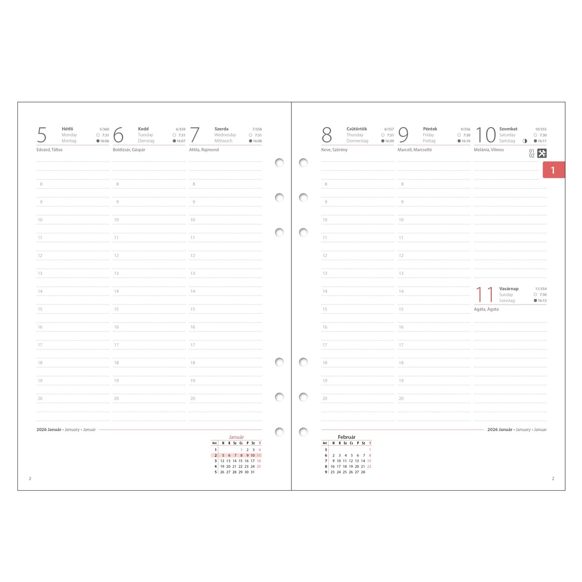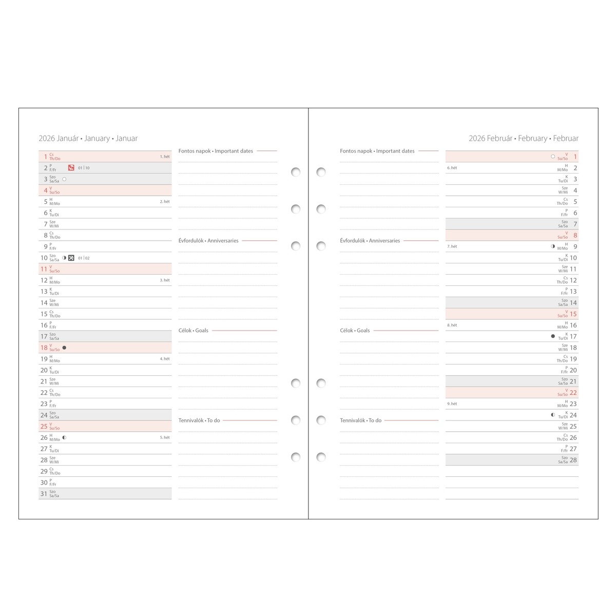 Filofaxhoz Naptárbetét Heti 1 hét / 2 oldal Magyar Oszlopos elrendezés (H-GB-D) A5 2026 Fehér