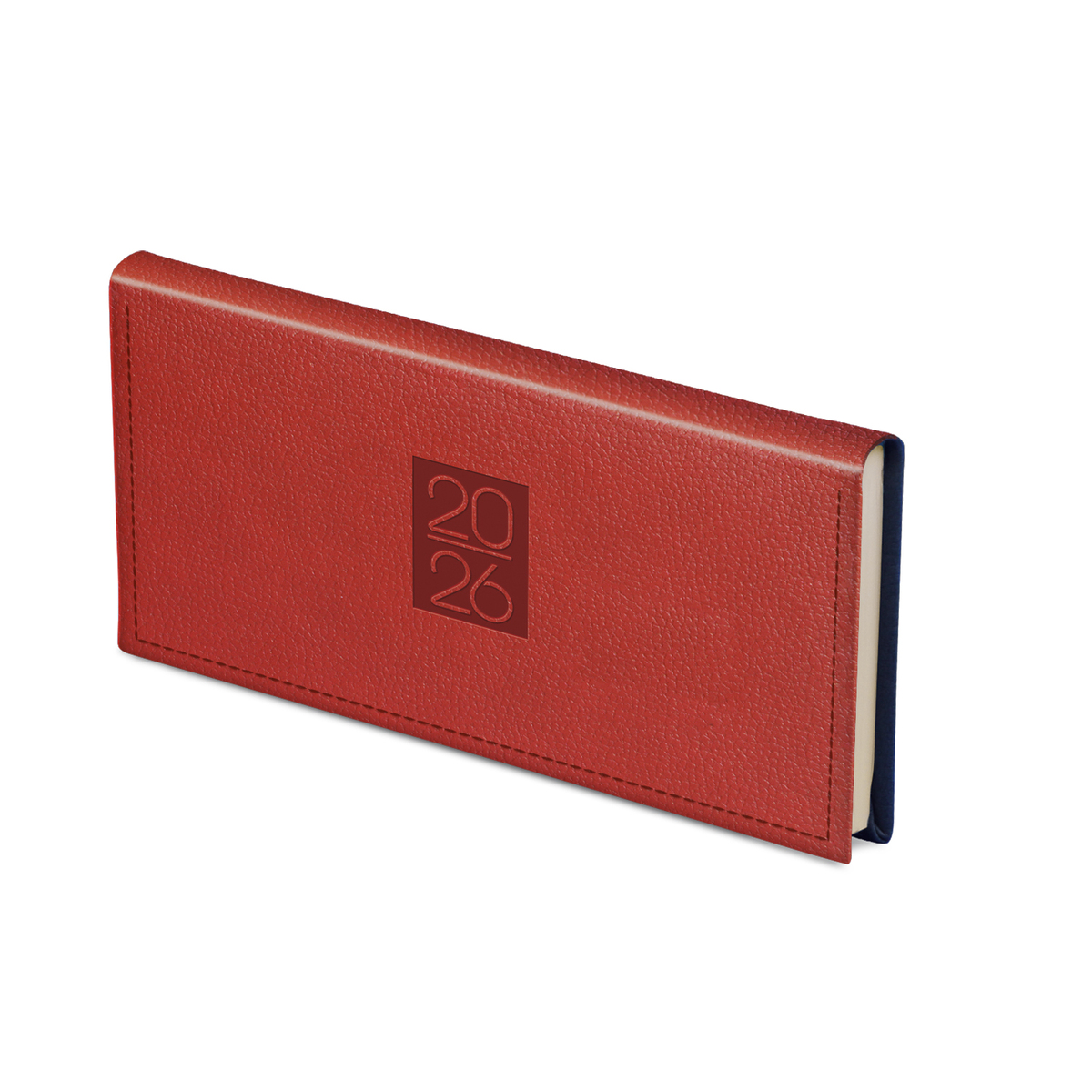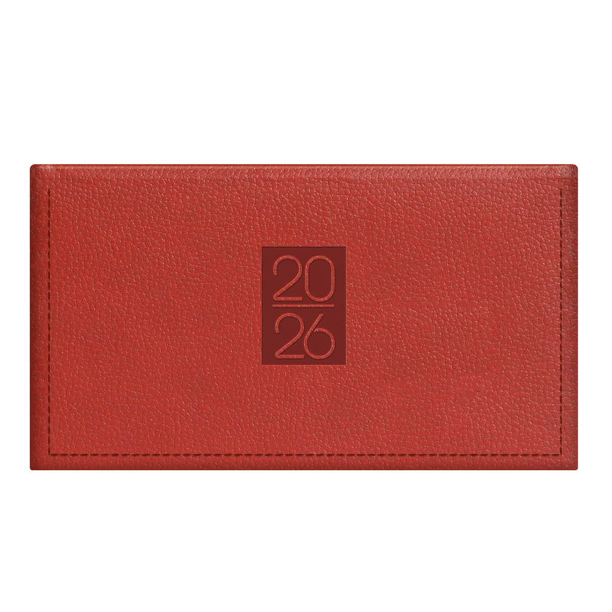 Prégelt, bőrhatású, hőre színeződő műbőr bevonóval, díszkerettel és elegáns évszámmal ellátott, chamois (krémszínű) tömbös fekvő zsebnaptár, színes oromszegővel és jelzőszalaggal. Színes térképet tartalmaz.