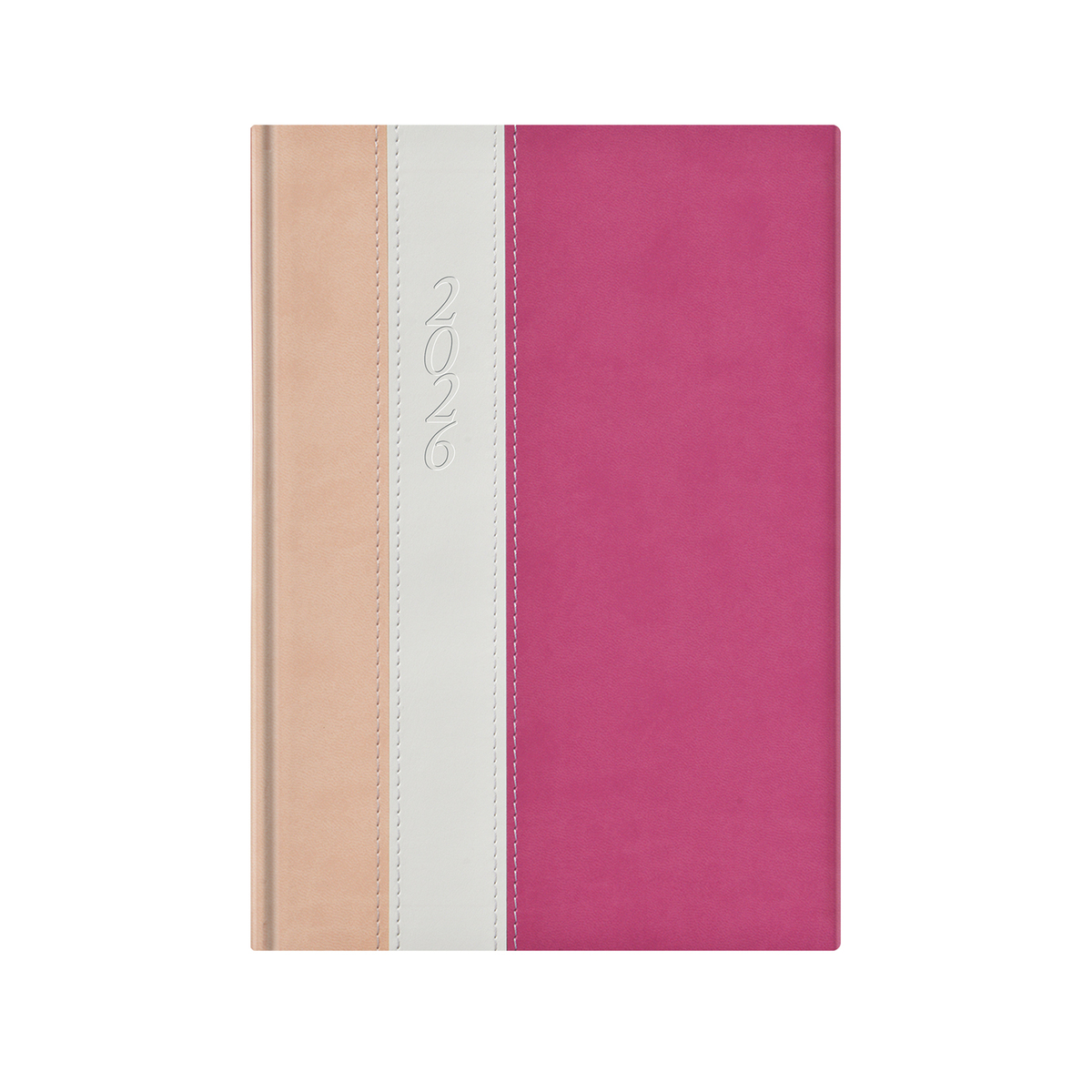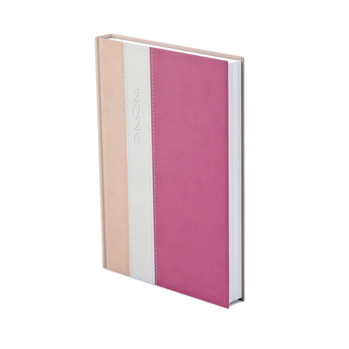 Kétféle, matt, bőrhatású és eltérő felületű, hőre színeződő műbőr bevonóval, varrással díszitett, fehér tömbös napi beosztású naptár, jelzőszalaggal és sarokperforációval. Elöl-hátul szivacsos fedlap. Színes térképet tartalmaz.