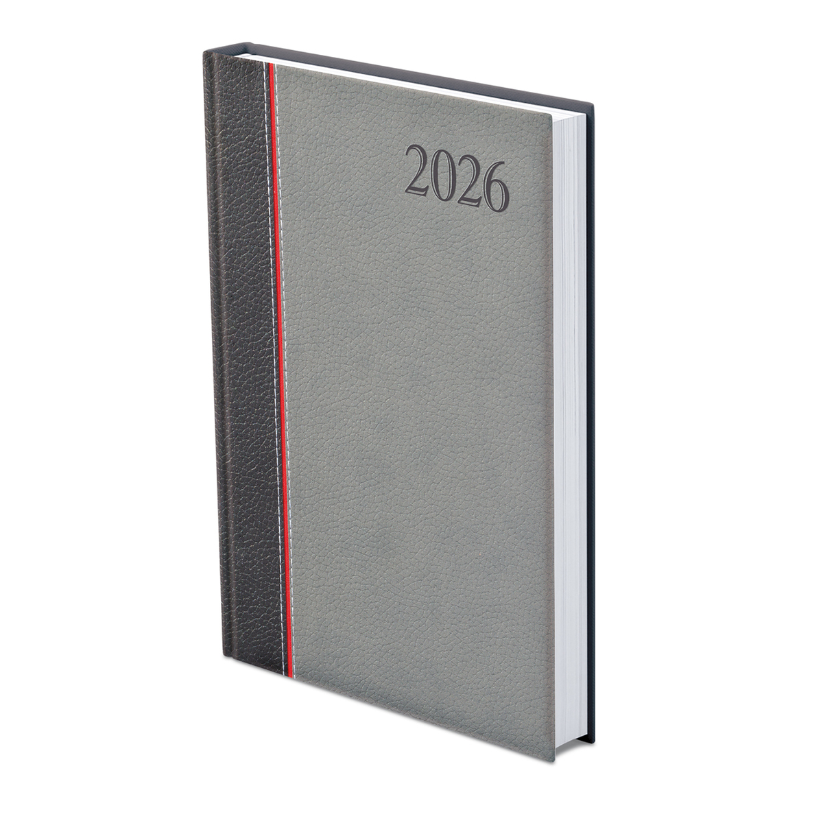 Matt, bőrhatású, hőre színeződő műbőr bevonóval, függőleges díszítő csík bevarrásával készült, fehér tömbös napi beosztású naptár, jelzőszalaggal és sarokperforációval. Elöl-hátul szivacsos fedlap. Színes térképet tartalmaz.