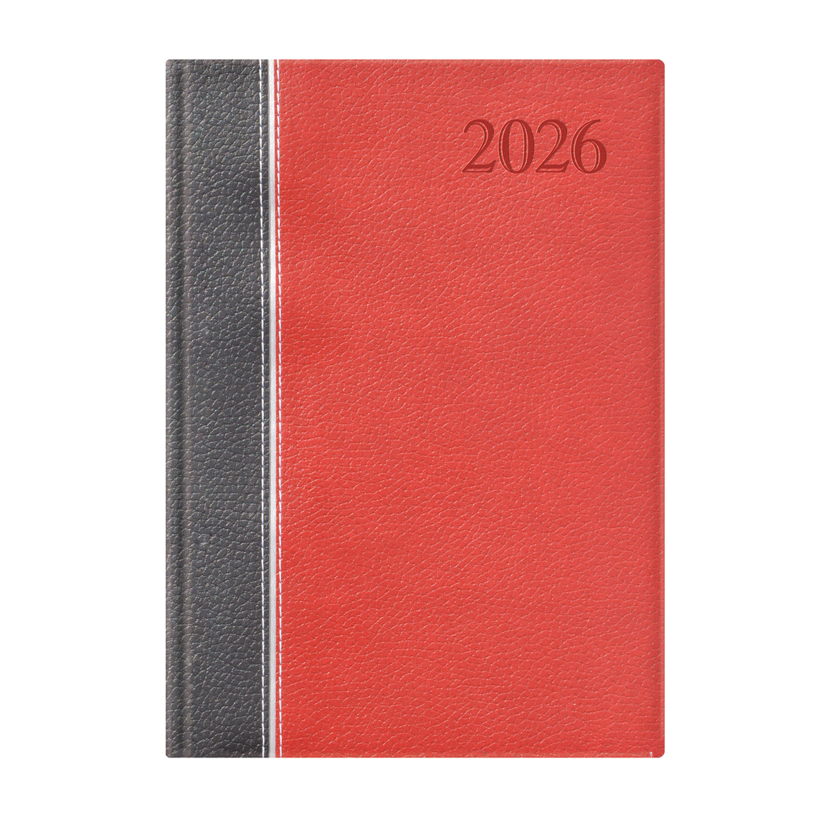 Matt, bőrhatású, hőre színeződő műbőr bevonóval, függőleges díszítő csík bevarrásával készült, fehér tömbös heti beosztású naptár, jelzőszalaggal és sarokperforációval. Elöl-hátul szivacsos fedlap. Színes térképet tartalmaz.
