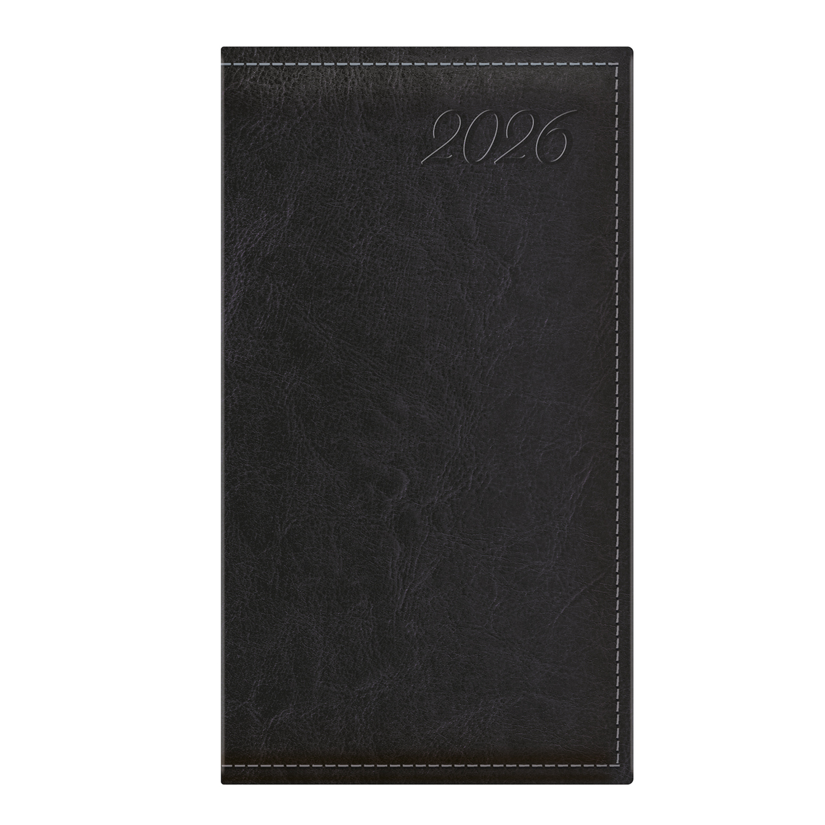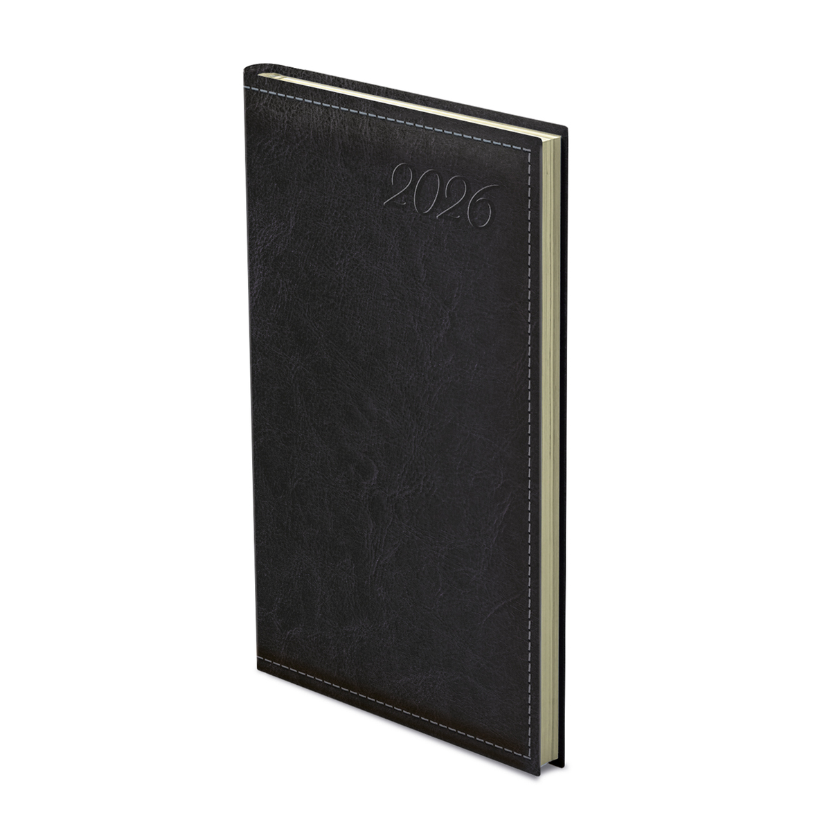 Magas fényű, bőrhatású, hőre színeződő műbőr bevonóval, varrott kerettel és légies évszámmal készített, chamois (krémszínű) tömbös álló zsebnaptár, színes oromszegővel, jelzőszalaggal. Színes térképet tartalmaz.