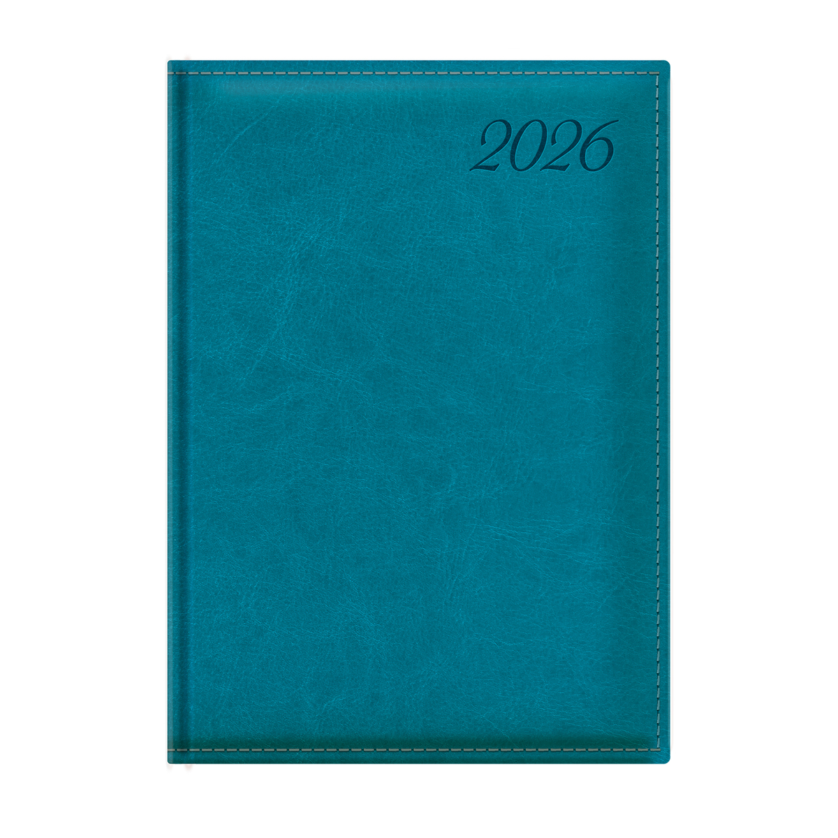 Magas fényű, bőrhatású, hőre színeződő műbőr bevonóval, varrott kerettel és légies évszámmal készített, chamois (krémszínű) tömbös napi beosztású naptár, színes oromszegővel, jelzőszalaggal és sarokperforációval. Elöl-hátul szivacsos fedlap. Színes térképet tartalmaz.