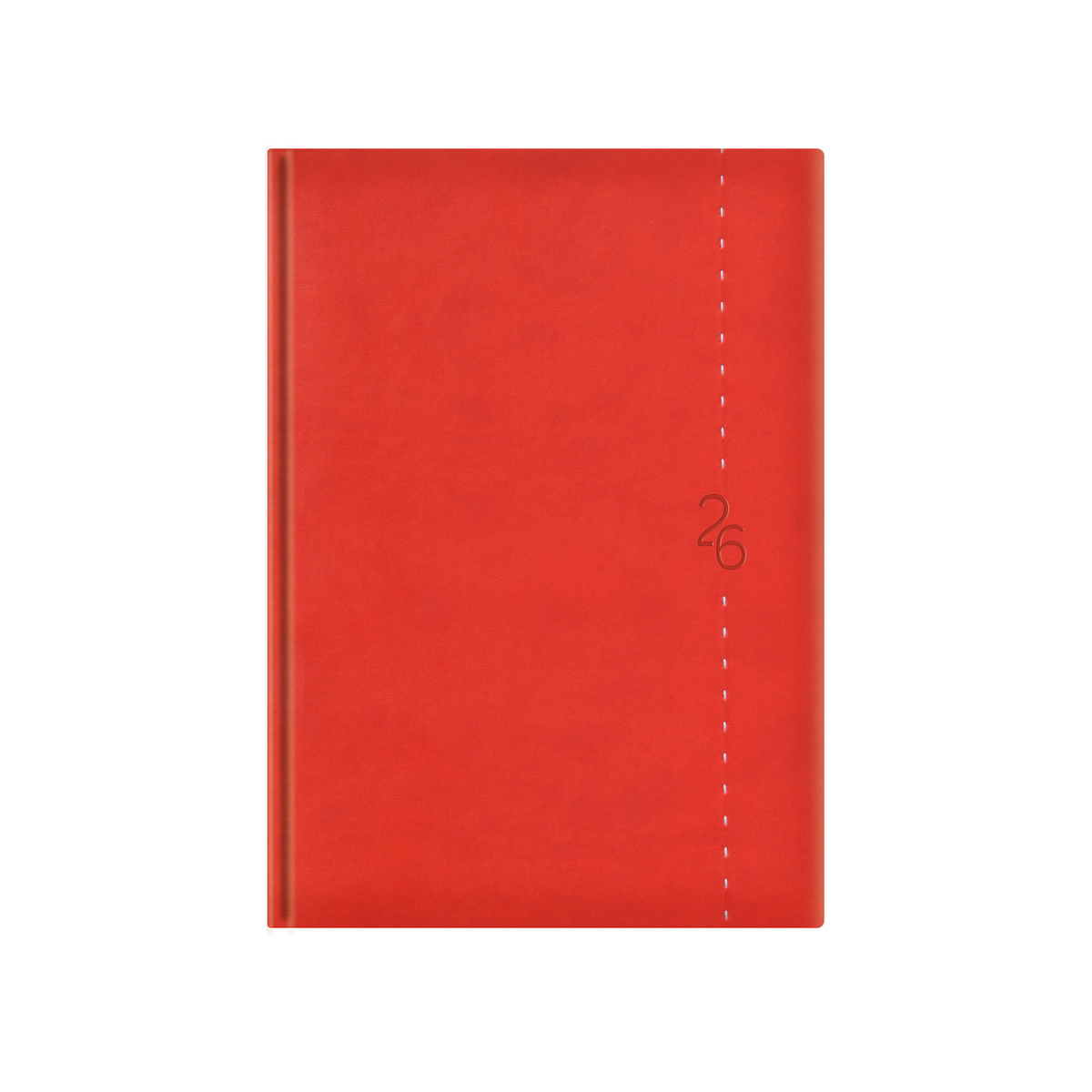Matt, bőrhatású, hőre színeződő műbőr bevonóval, függőleges dísztűzéssel készült, fehér tömbös, heti beosztású naptár, jelzőszalaggal és sarokperforációval. Elöl-hátul szivacsos fedlap. Színes térképet tartalmaz.