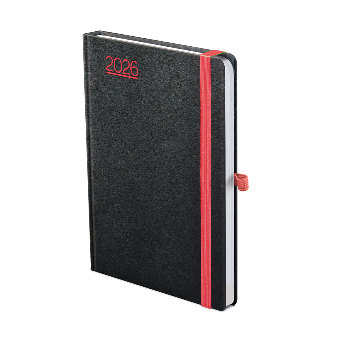 Fényes műbőr bevonóval, az átfogó gumiszalag színével megegyező évszámmal, tolltartóval, és sarokkerekítéssel készített, fehér tömbös napi beosztású naptár, a gumiszalag színével harmonizáló oromszegővel, jelzőszalaggal és sarokperforációval.