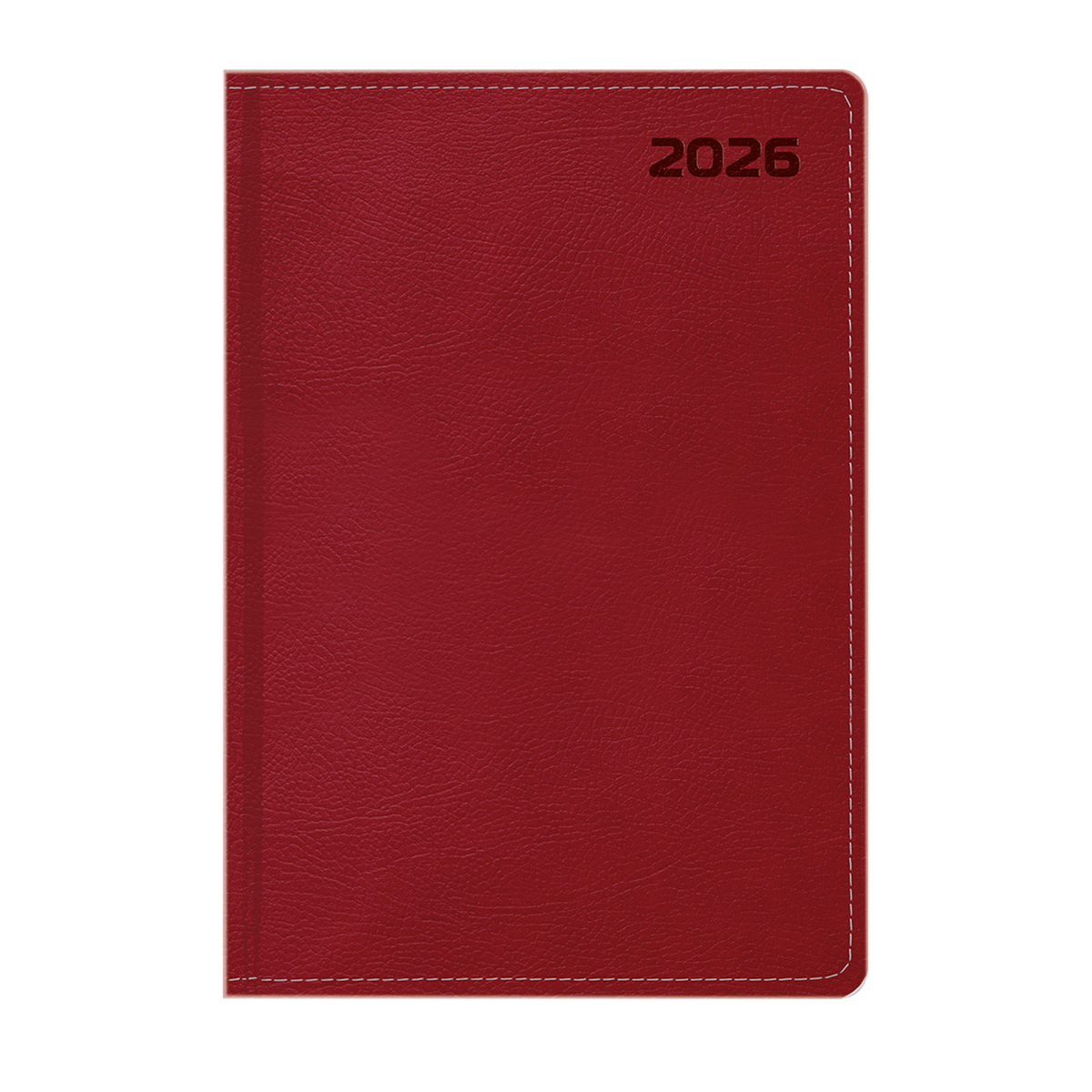 Matt, hőre színeződő, olasz műbőr bevonóval, varrott kerettel készült, chamois tömbös heti beosztású naptár, jelzőszalaggal és sarokperforációval.