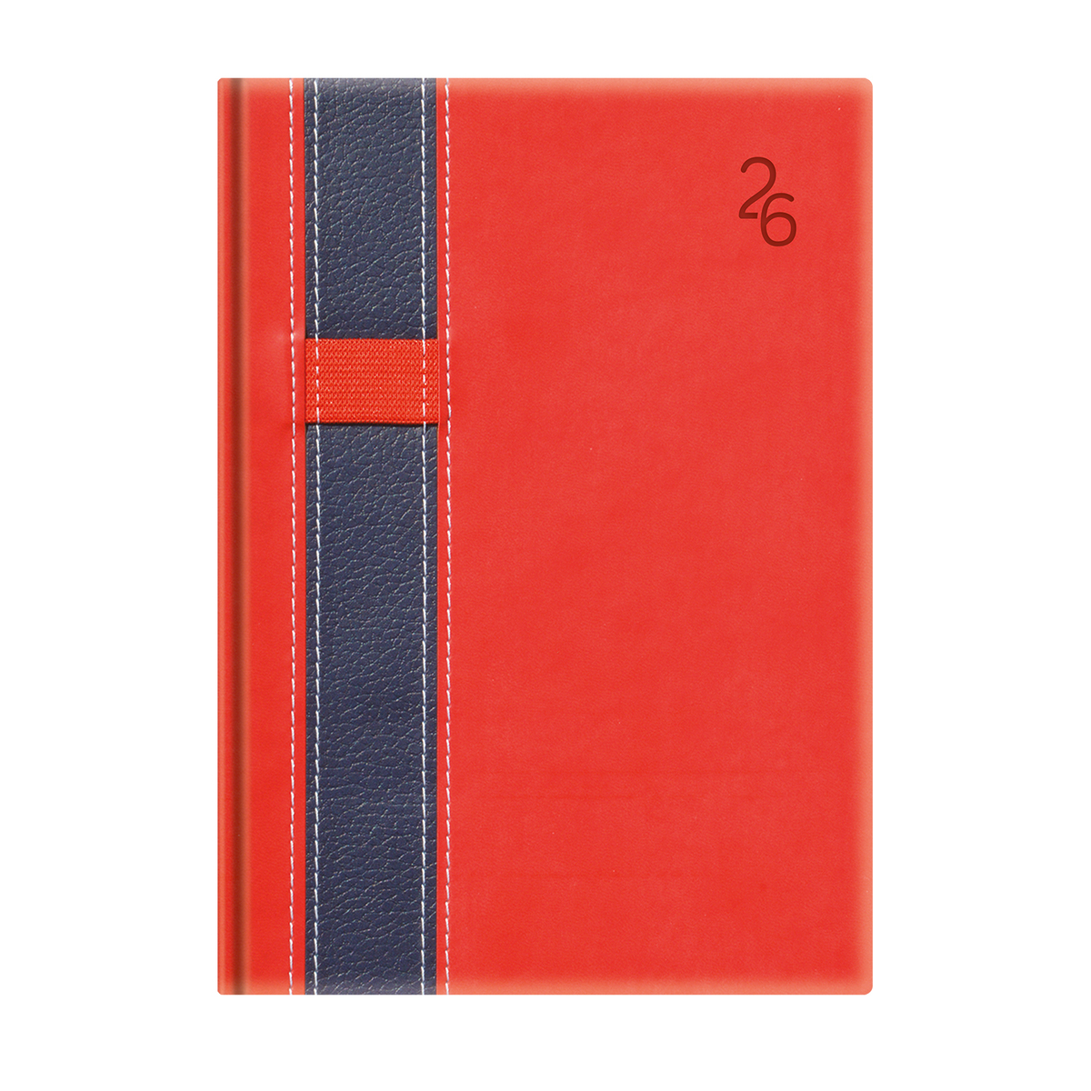 Kétféle, matt, bőrhatású és eltérő felületű, hőre színeződő műbőr bevonóval, varrással díszitett, gumis tolltartóval ellátott, fehér tömbös napi beosztású naptár, jelzőszalaggal és sarokperforációval. Elöl-hátul szivacsos fedlap. Színes térképet tartalmaz.