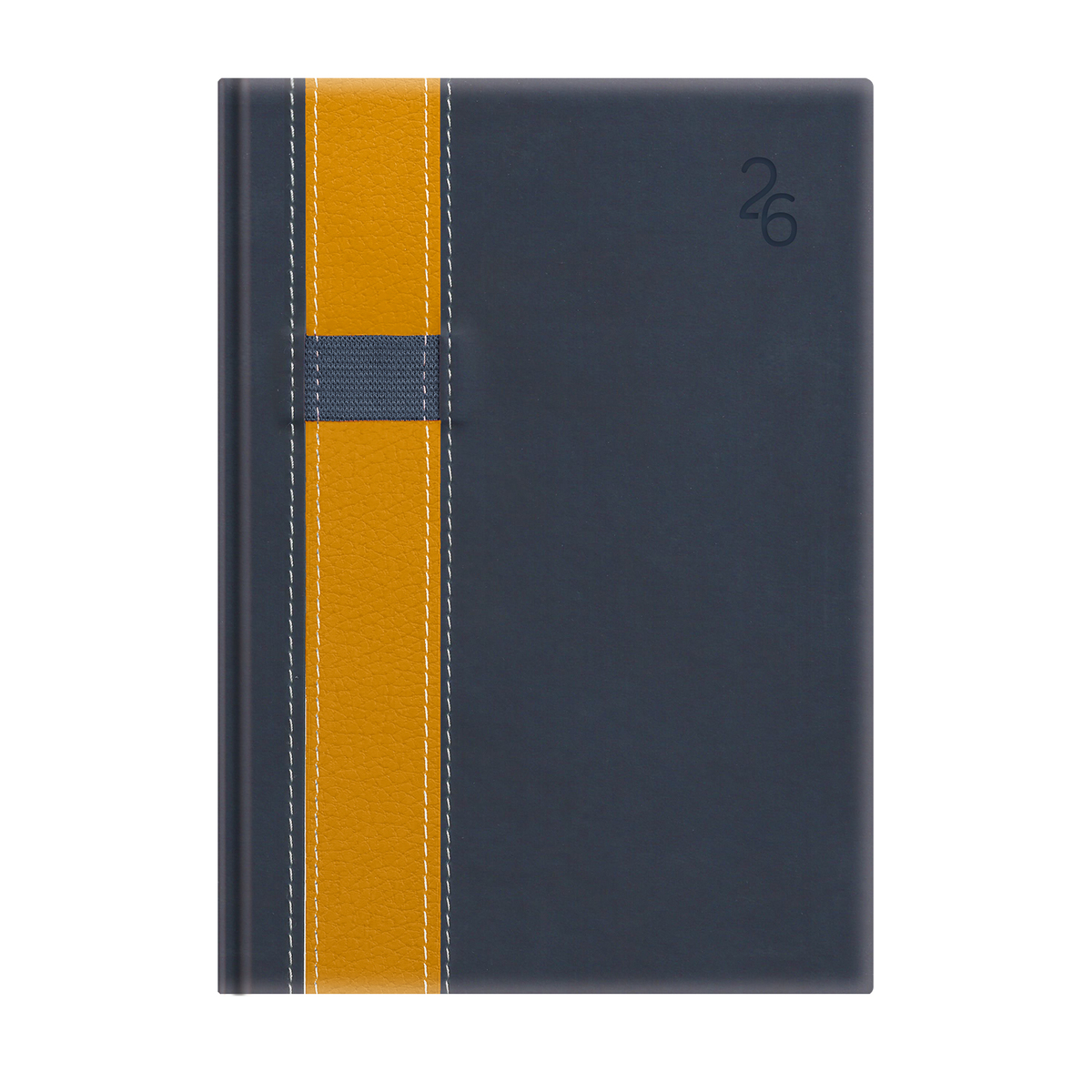 Kétféle, matt, bőrhatású és eltérő felületű, hőre színeződő műbőr bevonóval, varrással díszitett, gumis tolltartóval ellátott, fehér tömbös heti beosztású naptár, jelzőszalaggal és sarokperforációval. Elöl-hátul szivacsos fedlap. Színes térképet tartalmaz.
