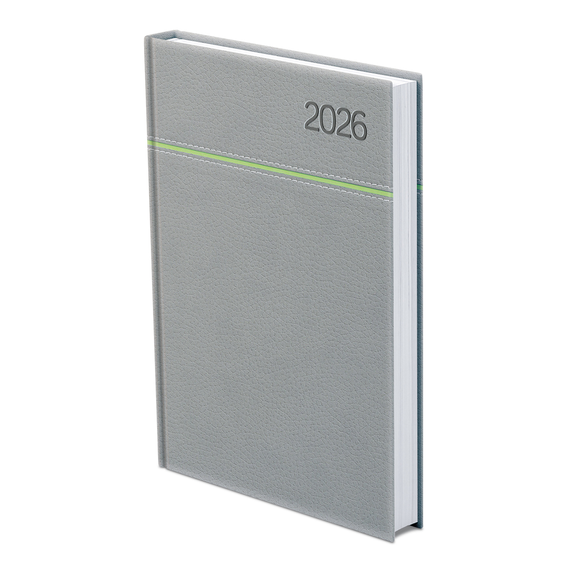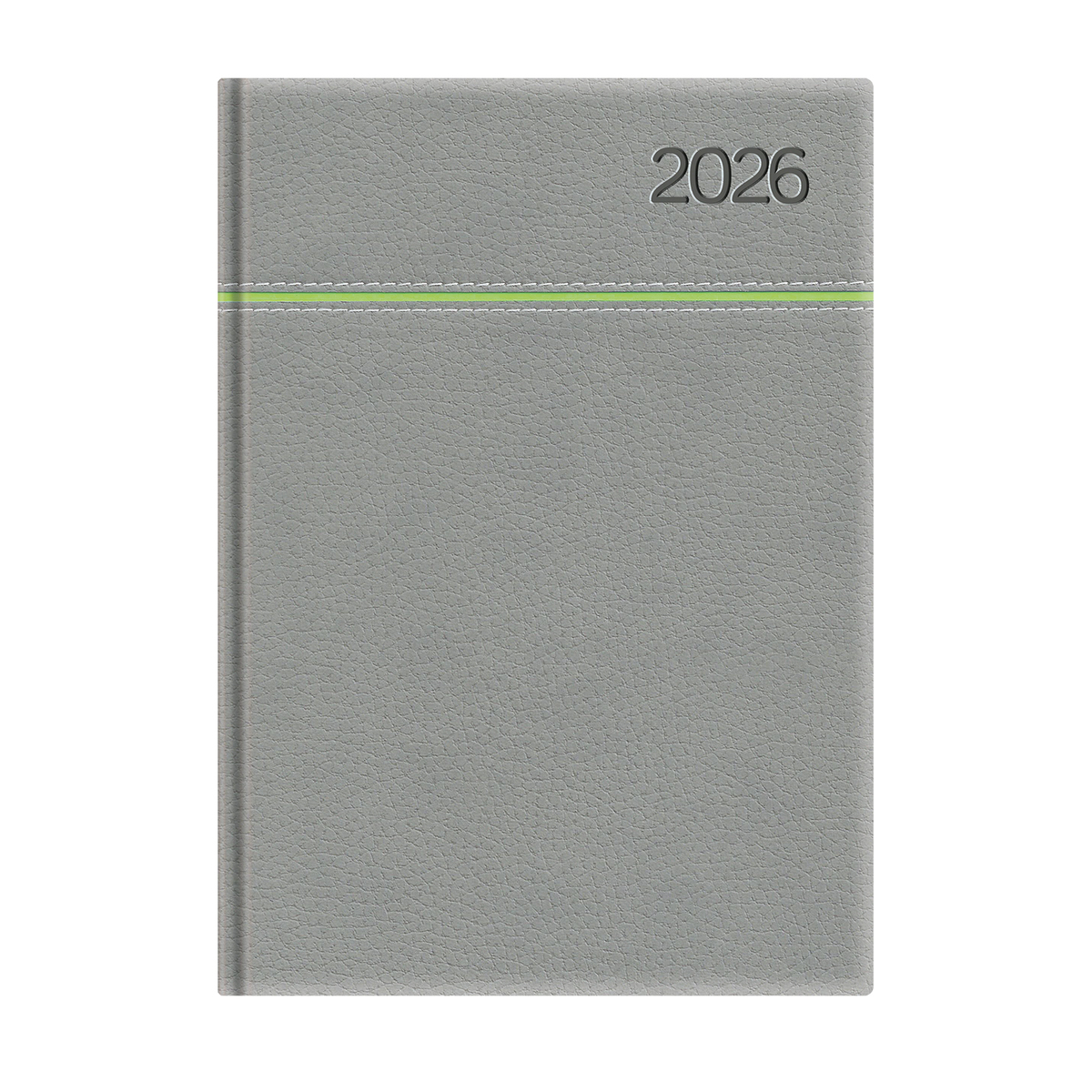 Matt, bőrhatású, hőre színeződő műbőr bevonóval, vízszintes díszítő csík bevarrásával készült, fehér tömbös napi beosztású naptár, jelzőszalaggal és sarokperforációval. Elöl-hátul szivacsos fedlap. Színes térképet tartalmaz.
