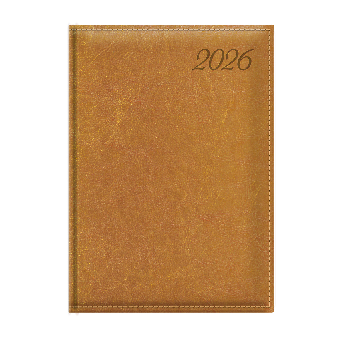 Magas fényű, bőrhatású, hőre színeződő műbőr bevonóval, varrott kerettel és légies évszámmal készített, chamois (krémszínű) tömbös napi beosztású naptár, színes oromszegővel, jelzőszalaggal és sarokperforációval. Elöl-hátul szivacsos fedlap. Színes térképet tartalmaz.