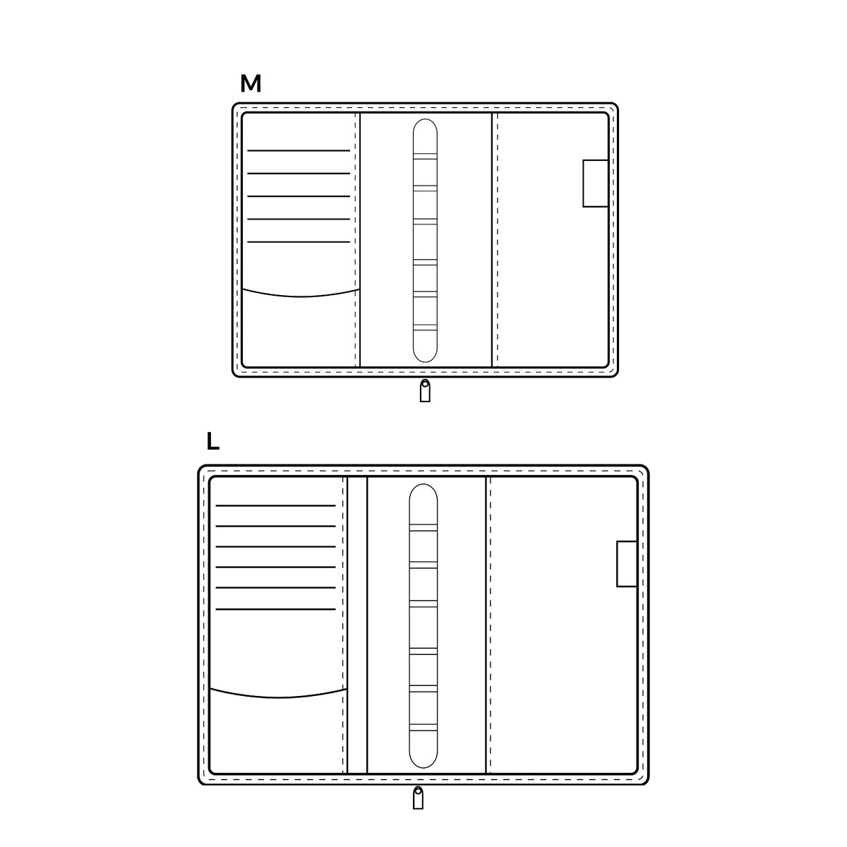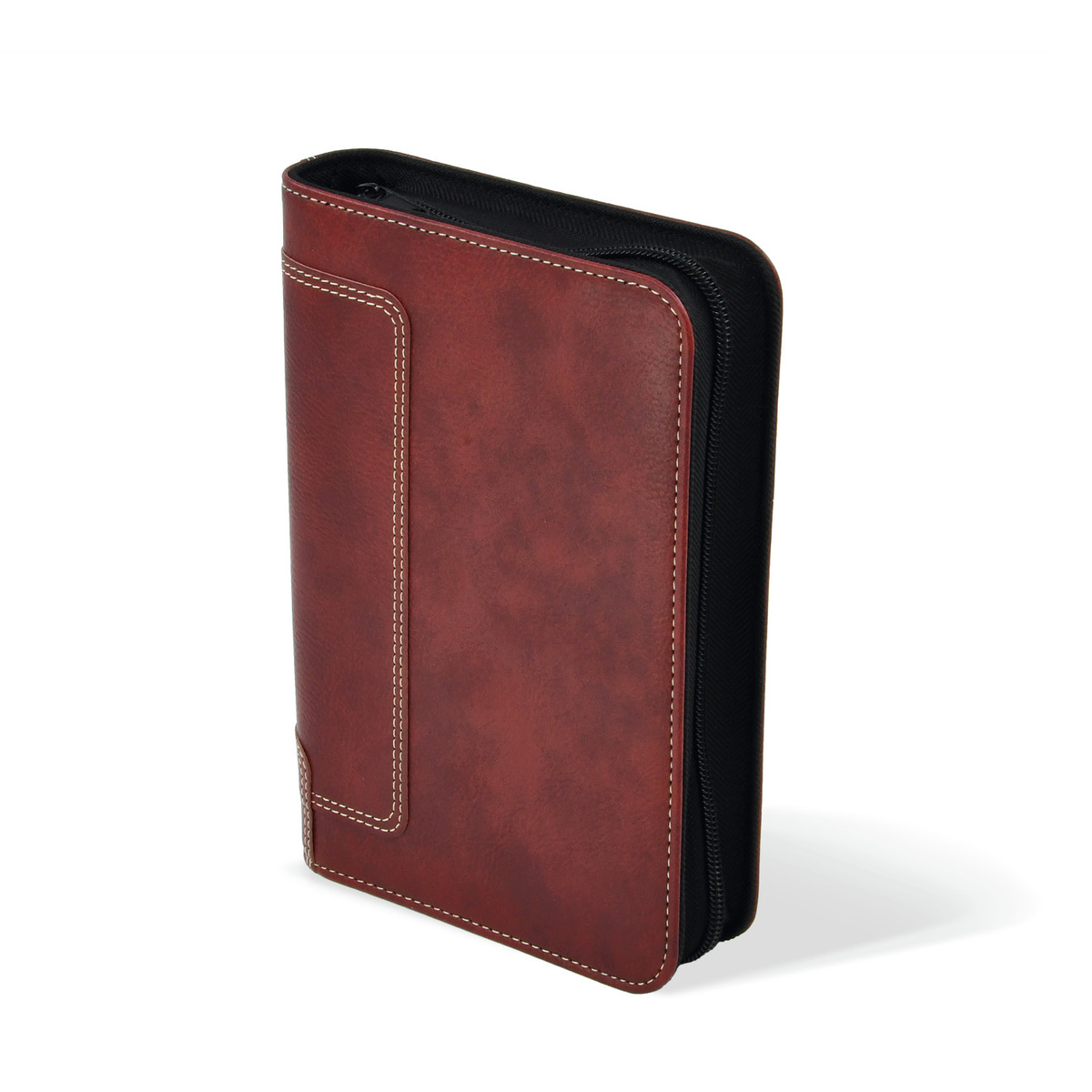 Sportos megjelenésű, prégelt felületű műbőrből, praktikus,cipzáras záródással készült, krém (Chamois) betétlapokkal töltött kalendárium.