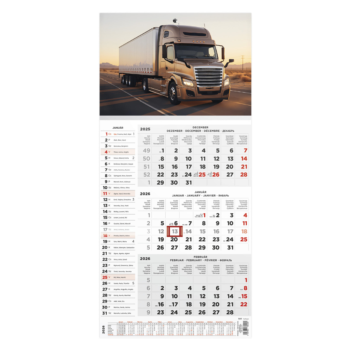 T077, 1 tömbből álló 3 havi speditőr naptár - Kamion fejrésszel