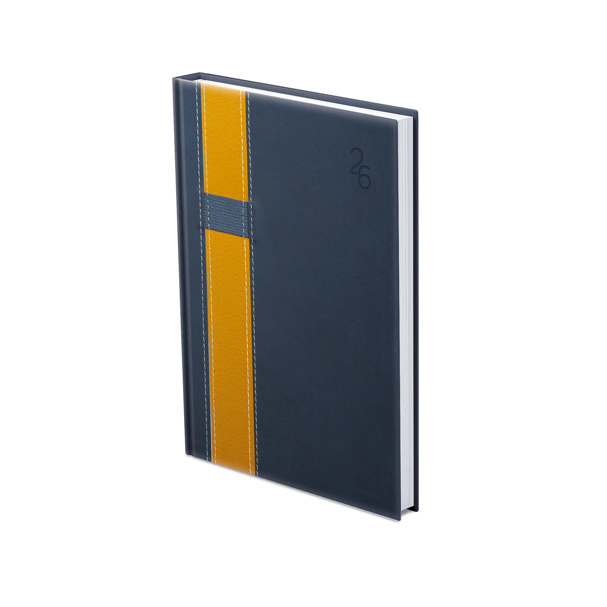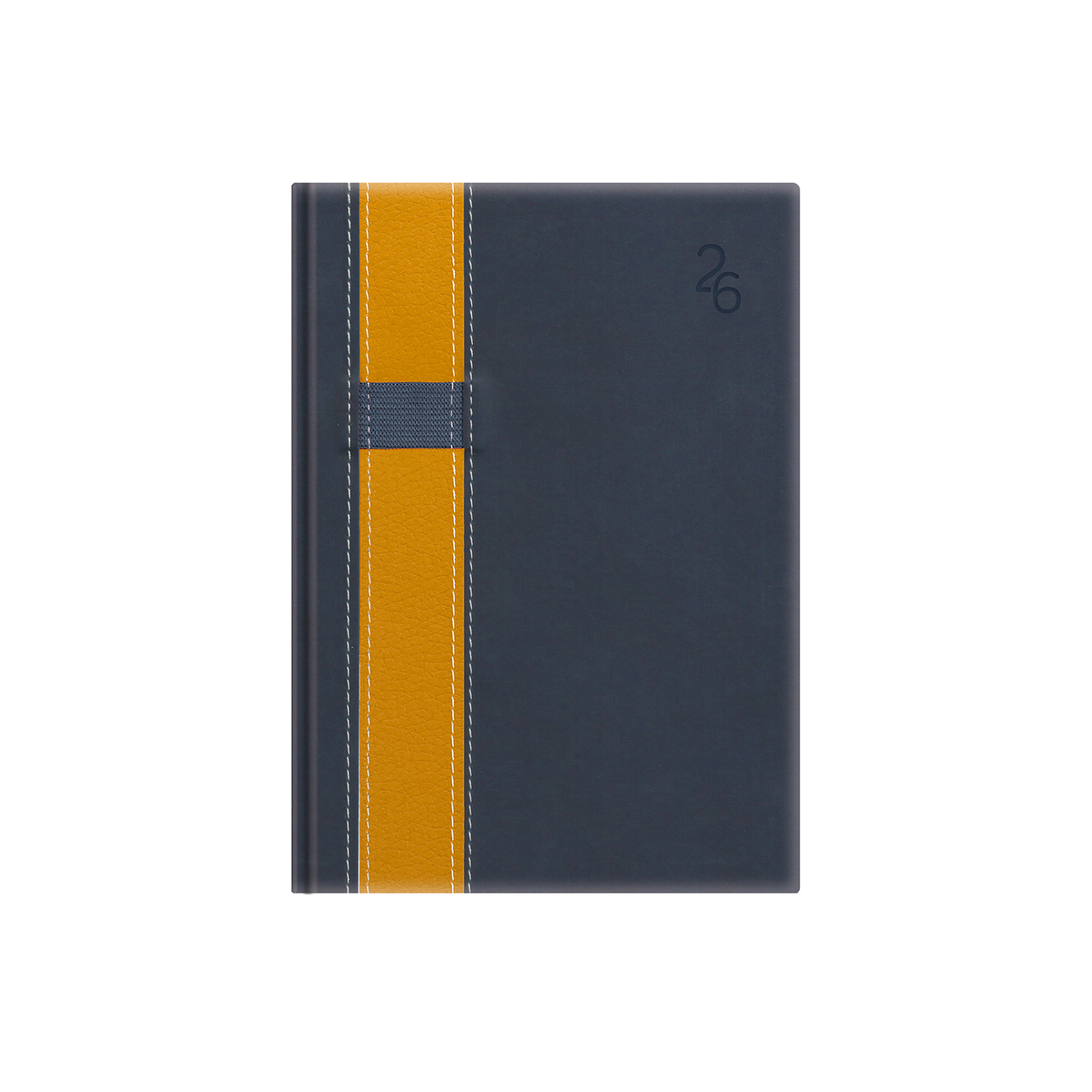 Kétféle, matt, bőrhatású és eltérő felületű, hőre színeződő műbőr bevonóval, varrással díszitett, gumis tolltartóval ellátott, fehér tömbös, heti beosztású naptár, jelzőszalaggal. Színes térképet tartalmaz.